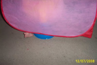 Look closely at the bottom of the pink hut. Yes, that is a baby foot. Makiah and Sam decided that they should all play in the hut. So Daniel and his basketball goal, Sam and Makiah were inside and I look around (I was on the computer, they were behind me), and what do I behold--a sweet little foot poking out.